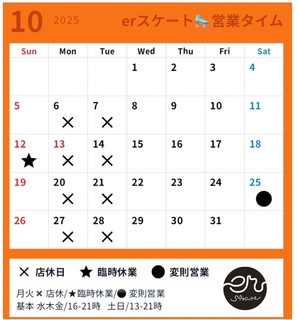 ローラースケート販売ショップ erスケートショップ 10月の営業スケジュールは