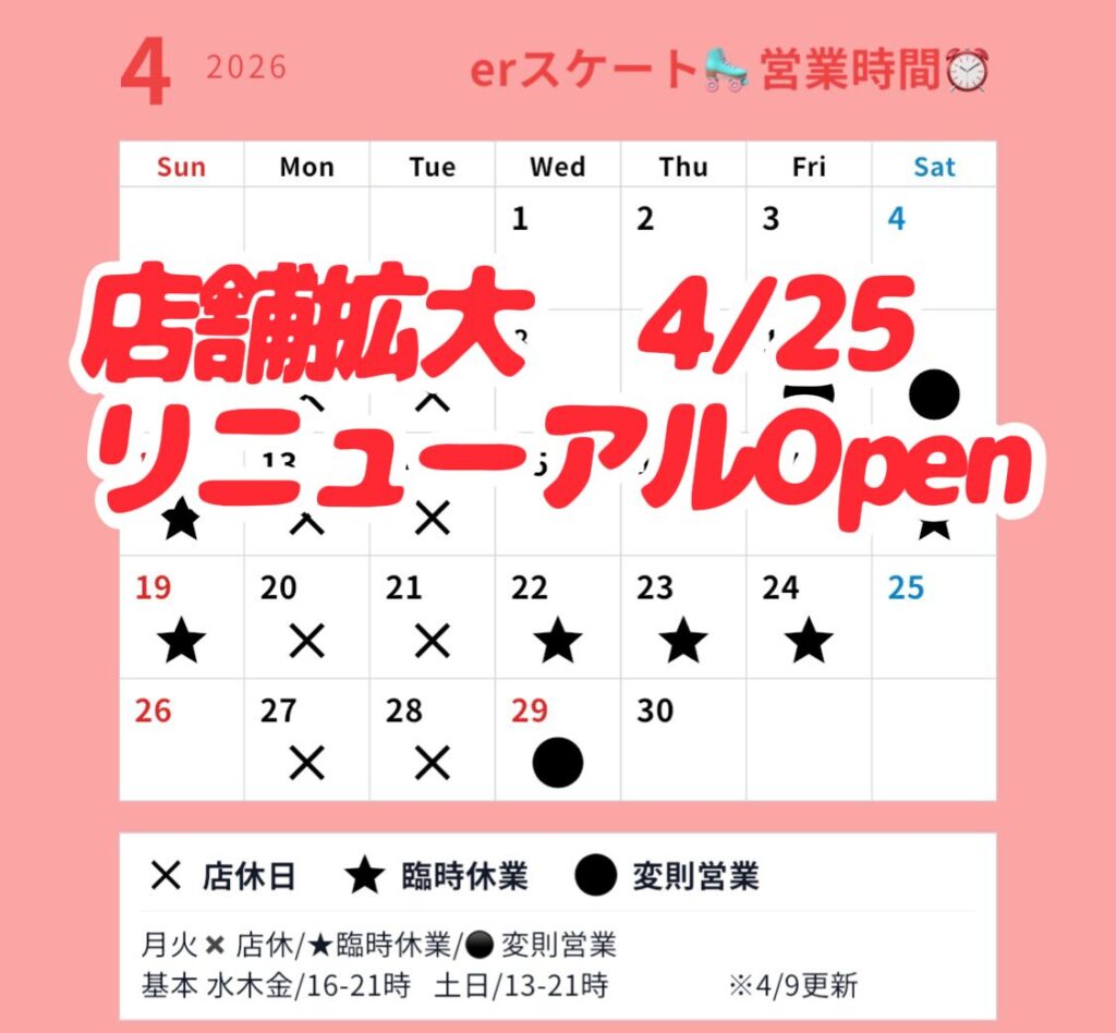 ローラースケートショップ erskateshopイーアールスケートショップ 【移転のご案内】4/25リニューアルオープン